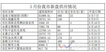溫州市房管局商品房網上銷售系統及瑞安透明售房網提供的信息顯示,5月份我市共有10個新盤上市,為市場提供房源1821套,總建筑面積達222338.1平方米。其中住宅項目1643套,非住宅178套。房源上市量環比4月份增加148%。