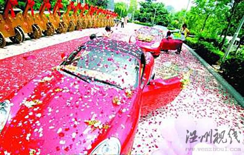 楊先生說,隨后他細數了一下發現,包括兩輛用作攝像車的別克商務在內,一共有43輛車,其中有十多輛敞篷跑車,十多輛奧迪Q7、寶馬X5,以及12輛奔馳面包車。“聽一些車主介紹,這些車中的豪車每輛都價值百萬元左右,總價至少3000多萬元!”另據楊先生介紹,這么多的豪車并非是婚車,而是訂婚,“這也太排場了。”楊先生說。