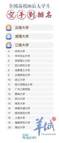 數(shù)據(jù)顯示,00后空手上學(xué)高校排名領(lǐng)先的省份是云南、江蘇、浙江、廣東和四川。這表明比起北方,南方大學(xué)生“空手到”功夫更好。