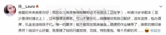 親愛的未來親家你好:我的女兒有房有保險暫時還不會游泳(正在學),年滿18歲會配車(至少是保時捷之上),過年隨便去哪家。可以不要彩禮,結婚嫁妝我自己配好,送車送房,包辦酒席,禮金全送給孩子們。唯一的要求:能不能現在就來接走,順便把作業輔導了,誰家的媳婦誰養呀!她沒什么好愛、就是隨了她媽只愛旅游、花錢、特別是包、每個月都得買……