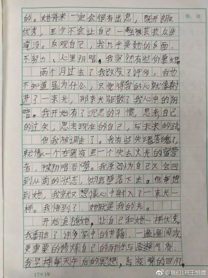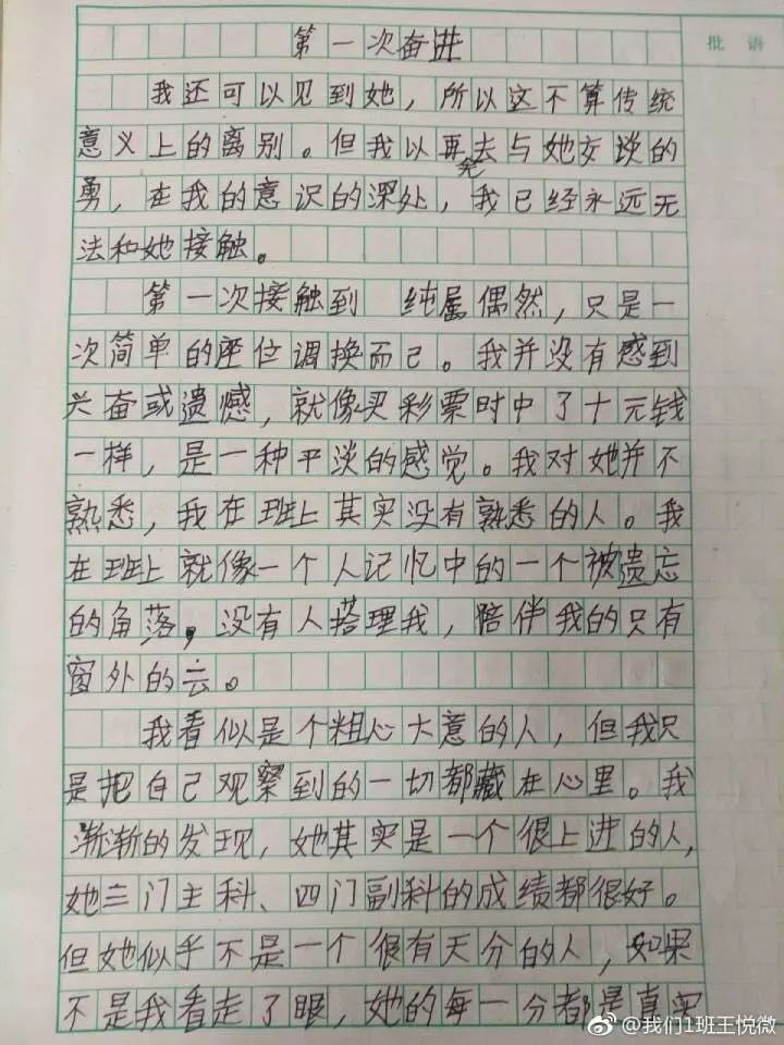 這篇題為《第一次奮進(jìn)》的作文,仔細(xì)讀完,發(fā)現(xiàn)明明是《第一次暗戀》,網(wǎng)友感嘆文筆太好了!第一句就被迷住了,這文筆,仿佛詩(shī)人。“我悟到了,她就是我的光”