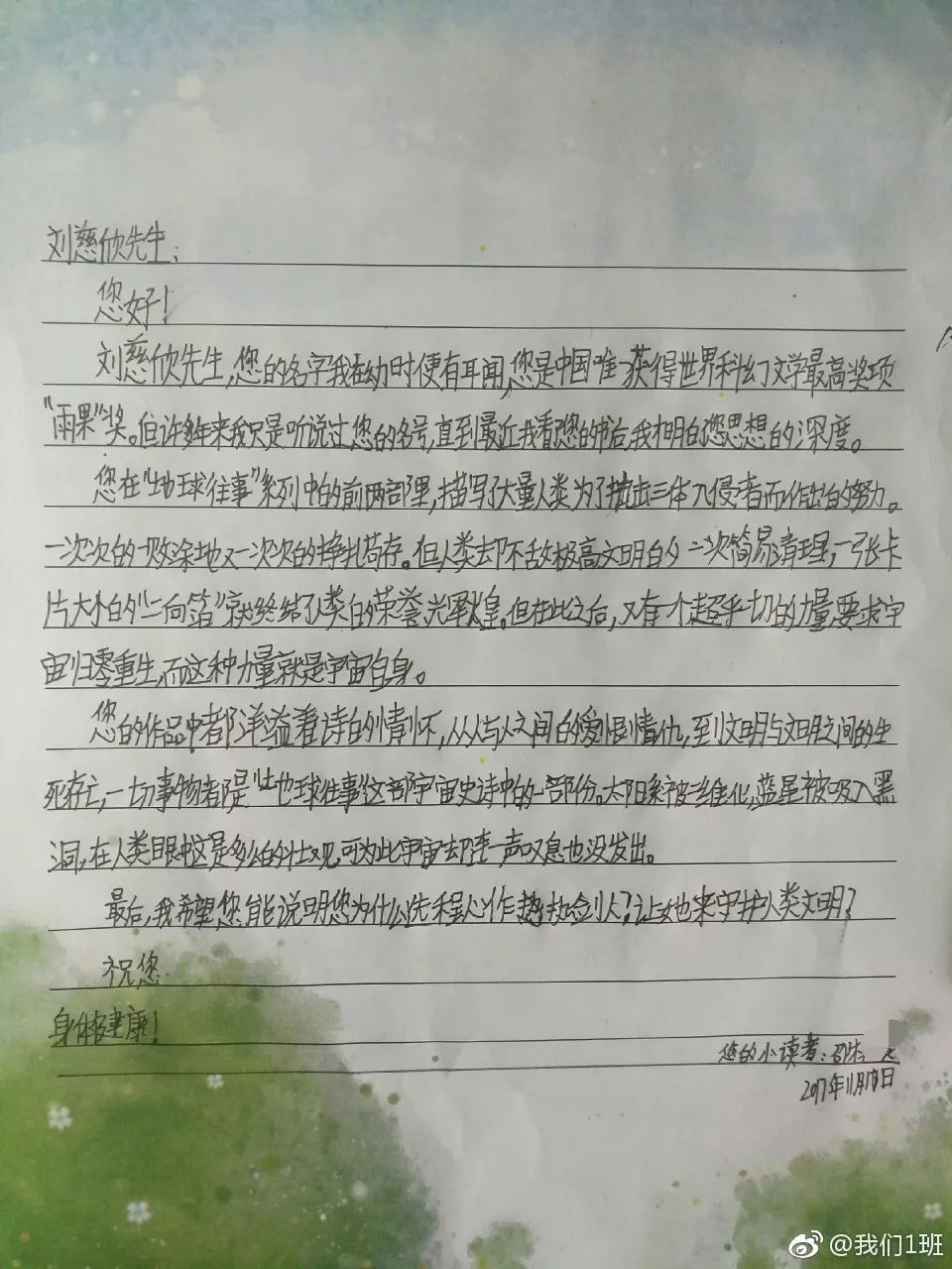 “他是個(gè)特立獨(dú)行的男孩,熱愛(ài)閱讀和寫作,尤其喜歡看歷史和科幻。他以前還寫過(guò)弗洛伊德《夢(mèng)的解析》讀后感,點(diǎn)評(píng)過(guò)《萬(wàn)歷十五年》。”王老師說(shuō)因?yàn)橄矚g科幻,他還給偶像劉慈欣寫過(guò)一封信: