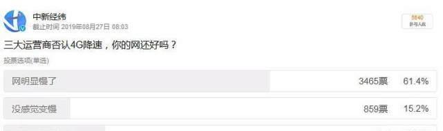 盡管三大運營商集體表示4G沒有降速,但社交平臺上確實有不少網友吐槽“4G確實變慢了”。近日,中新經緯官方微博發起的一項近6000人參與的調查顯示,約有61.4%的網友表示“網明顯慢了”,約有23.3%的網友表示“我的4G就沒快過”,僅有15.2%的網友表示“沒感覺變慢”。
