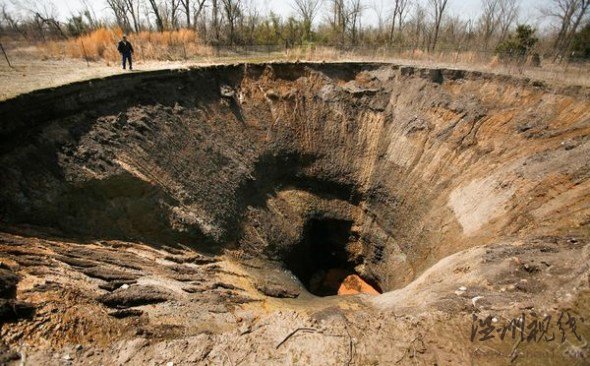 長年開采鋅礦和鉛礦讓俄克拉荷馬州與堪薩斯州交界附近皮謝爾的地面布滿陷坑,包括2008年所拍照片中的這個陷坑。一些礦在挖掘過程中距離地面太近,頂部無法支撐上方土壤的重量,最終導致塌陷。密蘇里州的格烏澤說:“密蘇里州和賓夕法尼亞州西部的煤礦附近也曾出現過陷坑。我們的建礦技術越來越高,頂部足以支撐上方土壤的重量。”