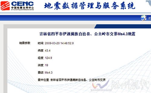 四平地震 據中國地震臺網中心數據顯示,2009年03月20日14:48分,吉林省四平市伊通滿族自治縣、公主嶺市交界發生4.3級地震。