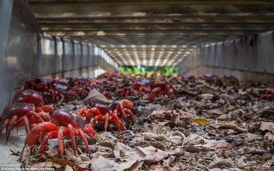 澳洲紅蟹大遷移:每年的10月底到1月初是澳大利亞圣誕島的雨季期間,就是紅蟹橫行圣誕島大遷徙的時(shí)間。澳洲紅蟹會(huì)離開叢林中的巢穴,遷徙到海邊進(jìn)行交配和產(chǎn)卵。從巢穴到海岸,距離是不一樣的。最短的一個(gè)星期左右可以到達(dá),最長(zhǎng)的需要20天左右。