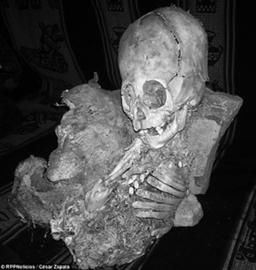 秘魯新出土木乃伊兩具,其中一個擁有奇大無比的頭顱,它有50厘米,長度幾乎等同于它的身體,這令人類學家百思不得其解。據悉,如此詭異木乃伊的發現地是秘魯南部曲斯皮坎奇省的安德華利拉絲市。人類學家稱,它的眼眶遠遠大于正常人類。此外,這個奇怪頭骨的腦門尚未閉合,這是一歲以內人類幼兒的獨有特征。但矛盾的是,它同時擁有兩顆大臼齒,這恰恰只存在于年齡稍大的人類。