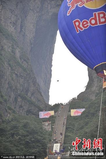 9月24日,世界最優秀的翼裝飛俠匯聚天門山,最刺激最高難度的極限運動在中國驚艷亮相,全球公認最頂尖、最勇敢、最強悍的極限運動家杰布·科里斯將進行“翼裝飛行穿越天門”的驚天挑戰。在第一次試飛失敗的情況下,成功挑戰人類飛行極限,無動力翼裝穿越湖南張家界天門洞。33歲的美國人杰布·科里斯以無動力的翼裝飛行,像鳥兒一般成功穿越險峻天門洞。