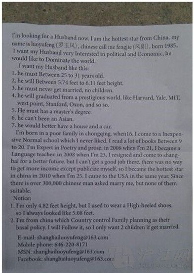 近日,網絡紅人鳳姐被曝在紐約哥倫比亞大學門前發傳單征婚。傳單上條件如下:1、年齡:25歲—31歲之間。2、身高175—186cm。3、沒結過婚,沒有孩子。4、畢業于世界名牌大學。如哈佛,耶魯,麻省理工,西點軍校等。5、取得碩士學位。6、非亞洲本土人士。7、有車有房。鳳姐并表示“超過300,000中國男人向她求過婚”。
