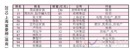 溫州新網來源溫州商報 胡潤研究院與第三方財富管理機構高傅財富俱樂部日前聯合發布《高傅2011胡潤上海財富白皮書》,同時揭曉2010上海富豪榜,胡潤富豪榜2010名單有溫州人11人,分別占上海富豪和外地駐上海富豪的10.09%和14.1%。