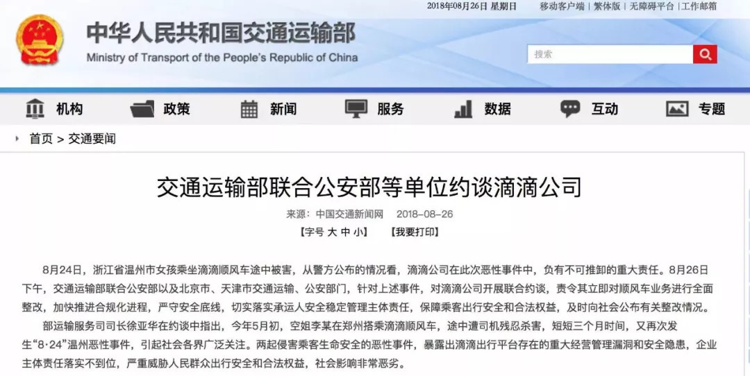 8月24日,浙江省溫州市女孩乘坐滴滴順風車途中被害,從警方公布的情況看,滴滴公司在此次惡性事件中,負有不可推卸的重大責任。8月26日下午,交通運輸部聯合公安部以及北京市、天津市交通運輸、公安部門,針對上述事件,對滴滴公司開展聯合約談,責令其立即對順風車業務進行全面整改,加快推進合規化進程,嚴守安全底線,切實落實承運人安全穩定管理主體責任,保障乘客出行安全和合法權益,及時向社會公布有關整改情況。