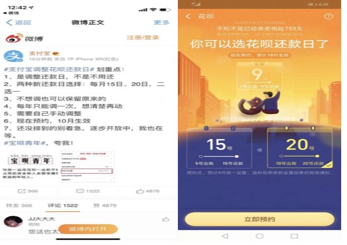 支付寶官方微博對(duì)此進(jìn)行了說(shuō)明,強(qiáng)調(diào)還款日每年只能調(diào)整一次,且目前部分用戶需要排隊(duì)。調(diào)整后,新浪微博方面立即開啟了微博超話#支付寶調(diào)整花唄還款日#,截至今日中午11點(diǎn)57分,超話閱讀量已達(dá)8352萬(wàn)。
