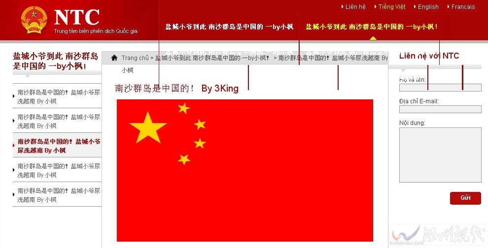 據記者觀察,自稱來自鹽城的黑客在越南外交部這一下屬網站首頁上留下了署名“3King”與“小楓”。目前該網站正中央貼著一面五星紅旗,網頁的左側及子鏈接均寫有“南沙群島是中國的!”等字樣。網頁下方分別用中英文寫著“南沙群島是中國的!過去是 現在是 將來也是!”。與此同時,網站內還在不停地播放著中國國歌《義勇軍進行曲》。