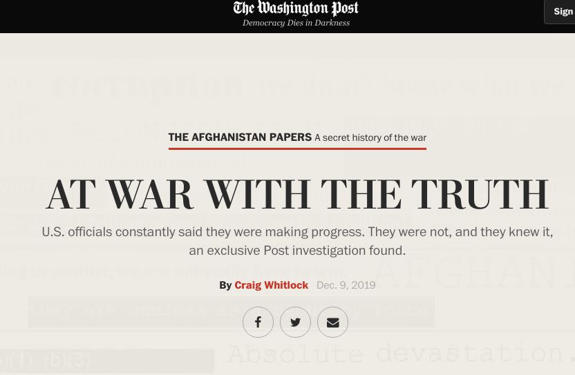 美國(guó)戰(zhàn)爭(zhēng)機(jī)密文件:2019年12月9日,《華盛頓郵報(bào)》發(fā)布題為“關(guān)于戰(zhàn)爭(zhēng)真相”的長(zhǎng)篇報(bào)道,他們獲取了2000頁(yè)的政府機(jī)密文件,披露美國(guó)政府在阿富汗戰(zhàn)爭(zhēng)問(wèn)題上長(zhǎng)期誤導(dǎo)公眾,隱瞞戰(zhàn)爭(zhēng)已無(wú)法取勝的事實(shí)。
