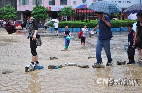5月19日,廣西昭平縣市民趁著雨停的間隙從積滿雨水的街頭通過。當日,廣西昭平縣遭遇大暴雨襲擊,截止中午11時,縣城降雨量已達65毫米,南部的北陀、富羅等多個鄉鎮降雨量已超過100毫米。 中新社發 喻湘泉 攝