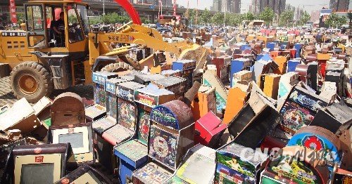 5月20日,河北警方舉行公開集中銷毀電子賭博機現場會,石家莊公安機關對近期開展的嚴打賭博專項行動中收繳的5483臺賭博機進行集中銷毀。廣場3臺推土機齊聲轟鳴,警方收繳的各類賭博游藝機被當眾碾碎。圖為賭博機銷毀現場。