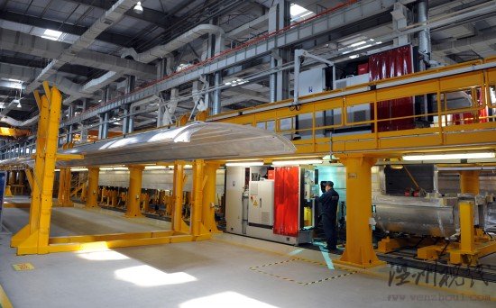 | 這是中國北車長春軌道客車股份有限公司高速車制造基地焊裝生產線(5月27日攝)。新華社記者 蔣林攝 |