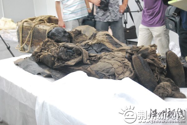 8月15日,荊州市文物局委托荊州市博物館、荊州市文物保護中心、松滋市博物館對暴露墓葬進行勘察,經現場勘查,墓葬位于宜陽一級公路與臨港大道起點相交的山頭,墓葬長約2米,寬約3米,深約2.5米,為一座合葬墓。其中西部棺蓋被揭開,人骨架被取出,東部木棺保存較好。8月18日凌晨,博物館工作人員開棺后,發現里面有保存完好的古尸,還有較多的絲織物,保存狀況較好,目前,母子合葬墓在湖北省僅此一例。
