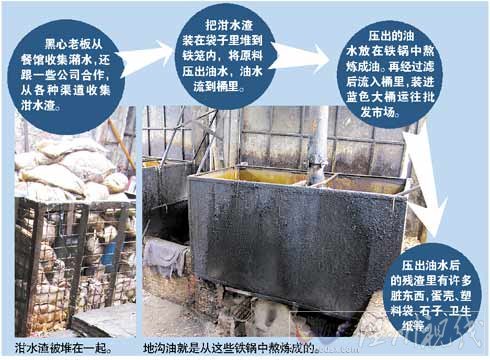 記者在暗訪中及跟隨執法人員查處中看到,那些用來熬制地溝油的原料實在令人作嘔:不僅散發著惡臭,殘渣里還混著石子、塑料袋和衛生紙、衛生巾。