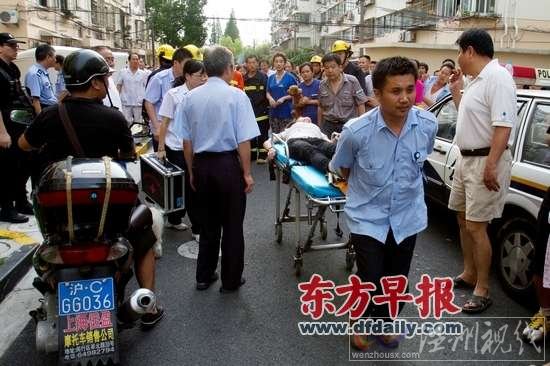 女子跳下后被急救人員迅速抬上救護車送往長寧區中心醫院救治。她頭部受了傷,暫無生命危險。早報見習記者孫湛圖