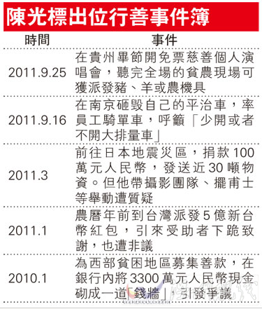 此前,陳光標(biāo)在個(gè)人微博上也表示,他想用歌聲來(lái)表達(dá)他對(duì)慈善的執(zhí)著,增加現(xiàn)場(chǎng)互動(dòng),給百姓送豬送羊是希望他們能夠真正奔向小康。