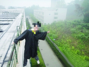 記者留意到,兩張照片中的學生都身穿學士服。其中一張學生站在一個距離地面幾米高的平臺欄桿外,僅單手握住欄桿,而且單腳懸空,身體還在拼命向外伸展,作出“飛翔”狀。另一張照片中,學生則作出“灌籃”狀,雙手攀在籃球架的籃筐上,雙腿彎曲。“萬一沒有抓緊欄桿掉下去怎么辦?萬一籃球架倒下來可要砸死人的。”阿鳴表達了自己的擔憂,還特別提醒,“青春有活力本沒有錯,但千萬別拿自己的生命開玩笑。”