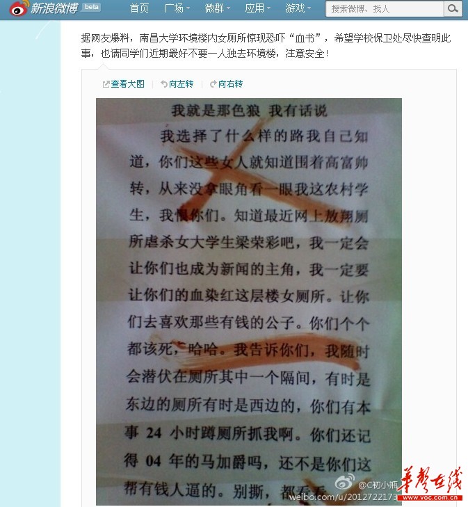 偷窺男女廁留血書,南昌大學學生通訊社報道了這一事件