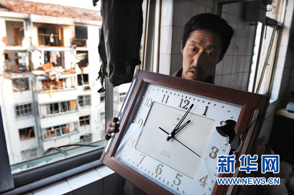 10月15日,蒿泊西1區(qū)對面樓爆炸時被震壞的掛鐘時間停止在1點3分。新華社記者李紫恒攝