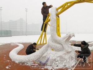 在1月22日下午,一位名叫網(wǎng)友@飛行的老屋在新浪石家莊吧發(fā)帖稱:在河北師范大學(xué)操場上,看見有同學(xué)在做20多米長的巨蟒雪雕,冰雕做的非常逼真,連蟒蛇身上的鱗片都依稀可見。此貼一發(fā),立即引來大量網(wǎng)友圍觀,很多人大呼:河師大的學(xué)生太有才了。據(jù)了解,這個巨蟒冰雕創(chuàng)意來自河師大的10級雕塑系葛旭陽、祖朝陽兩名同學(xué)。作品最后則由葛旭陽、祖朝陽以及老同學(xué)畢學(xué)龍、唐艷帥一起完成。最后也由他們?yōu)檫@個冰雕取名“白娘子”。