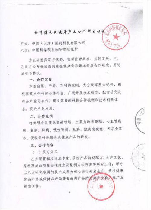 澎湃新聞?dòng)浾呖吹降倪@份中科院生物物理研究所和中恩醫(yī)藥簽署的《特殊膳食及健康產(chǎn)品合作研發(fā)協(xié)議》中,雙方的合作范圍是“特殊膳食及健康領(lǐng)域,主要為改善睡眠、心血管疾病、肝病、肺病、慢性腎病、肥胖、肌肉衰減癥、術(shù)后全營(yíng)養(yǎng)、便秘等特殊膳食及健康產(chǎn)品的研發(fā)”。