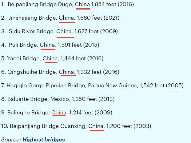 目前,在10座世界最高大橋,除了第七(位于巴布亞新幾內亞)和第八(位于墨西哥)外,其余八座橋梁都來自中國!