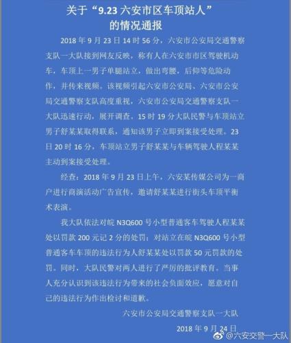 2018年9月24日,安徽省六安市局交警隊官微消息發布《關于“9.23六安市區車頂站人”的情況通報》。被舉報當事男子站在一輛汽車頂部不顧危險,玩其了“金雞獨立”并向后仰翻約90°,而后收回。整個視頻只有短短10秒鐘,卻成功吸睛,引起廣大網友的關注并遭到舉報。六安警方隨后勒令其接受處罰。9月24日上午,六安市公安局交警支隊一大隊發布了該事件的處理結果通報。