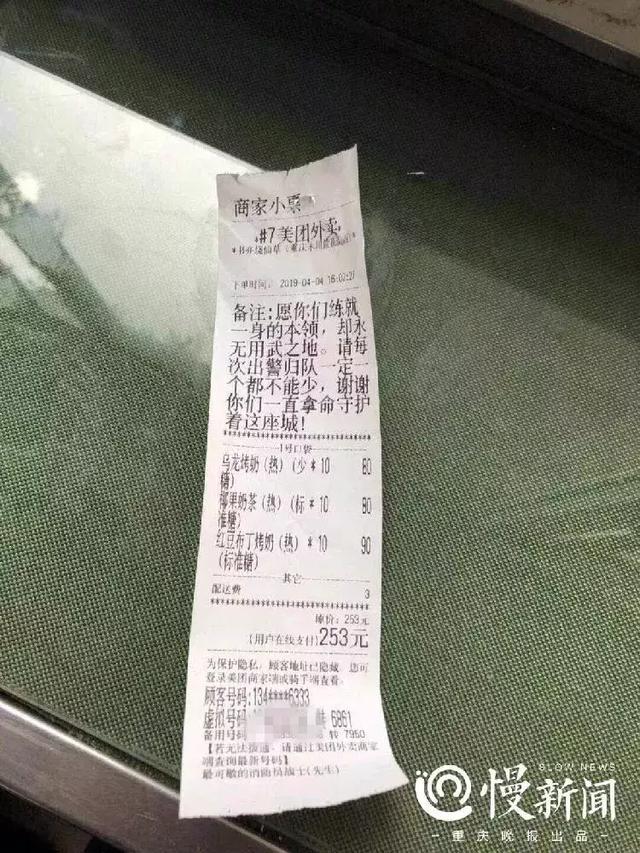 第二次是通過外賣送來的30杯奶茶,并在快遞單上寫著:“送消防隊的消防員們,希望能給他們一點安慰吧,希望他們都好好的,辛苦了吧!(請他們務必收下,一點心意而已,辛苦了快遞小哥哥!)”