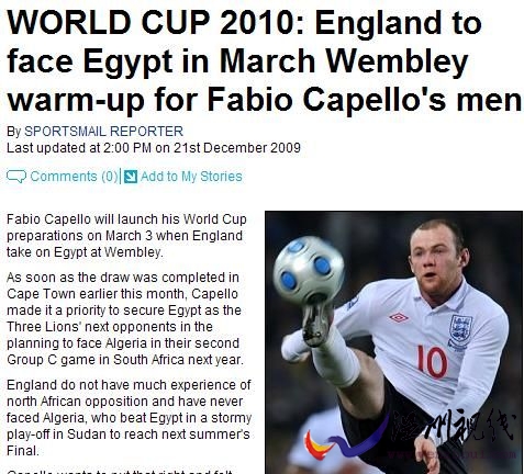 在本月初世界杯分組抽簽出爐后,英格蘭國家隊主帥卡佩羅就把埃及列為世界杯熱身賽的主要對手,因為在世界杯小組賽中,“三獅軍團”將迎戰同為非洲球隊的阿爾及利亞。