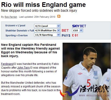 在特里因?yàn)椤坝哑揲T”事件被剝奪隊(duì)長臂章后,卡佩羅任命了費(fèi)迪南德為英格蘭新隊(duì)長,但是這位曼聯(lián)中衛(wèi)本賽季長期受困背部傷勢,現(xiàn)在他再次因?yàn)楸巢渴軅标嚒?/p>