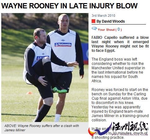 英格蘭主帥卡佩羅昨晚接到了一個令他憂心忡忡的消息,曼聯射手魯尼可能無法出戰與埃及的熱身賽。意大利鐵帥必須考慮是否冒險使用魯尼,這是他決定世界杯名單前的最后一場比賽。