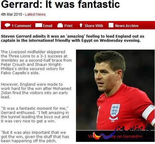 英格蘭在溫布利球場3-1逆轉非洲杯冠軍埃及,杰拉德時任三獅軍隊長。一場勝利,一次榮耀,即便這只是聯賽間歇期內的熱身賽,但對于從小夢想著能夠成為英格蘭隊長的杰拉德而言,意義卻是非凡的。賽前,紅軍隊長就曾表示:“這是我的夢想,聽到這個消息后我非常興奮。”