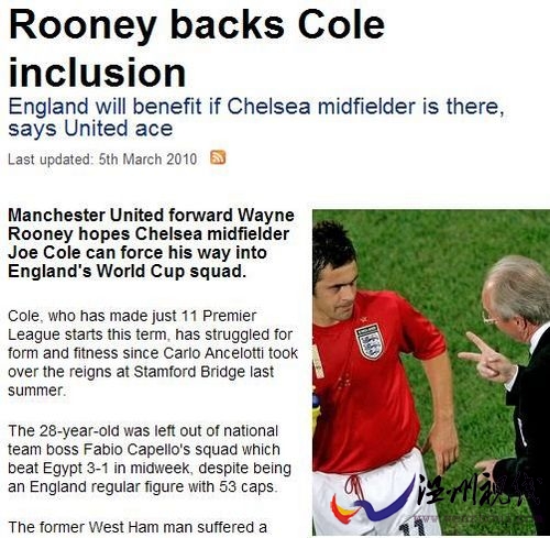 曼聯(lián)前鋒魯尼希望切爾西中場(chǎng)喬科爾能進(jìn)入英格蘭的世界杯名單,他相信這位曾參加過(guò)上屆世界杯的藍(lán)軍球員能在南非給“三獅軍團(tuán)”帶來(lái)好處。