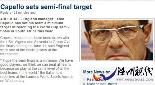 英格蘭國家隊主帥卡佩羅確定了南非世界杯目標,他表示,“三獅軍團”至少要闖進四強。