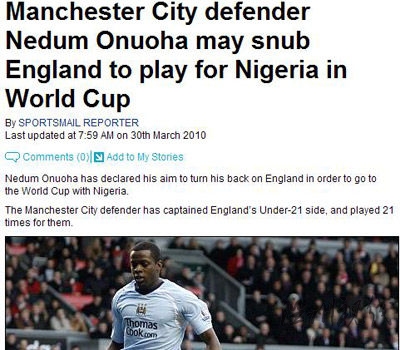 為了能參加南非世界杯,英格蘭U21國家隊隊長奧諾哈主動向尼日利亞示好,他表示可能會選擇代表尼日利亞參加成年隊的國際比賽。
