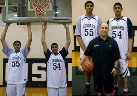 這對印度巨人兄弟已經(jīng)加入了加拿大國籍,目前就讀于美國賓夕法尼亞州的科士奇高中,哥哥名叫希姆·布拉(Sim Bhulla),弟弟名叫坦維爾·布拉(Tanveer Bhulla)。17歲的哥哥希姆身高達到7尺4寸(2米25),15歲的弟弟坦維爾也有7尺2寸(2米19),他們被譽為世界上最高的籃球兄弟組合。