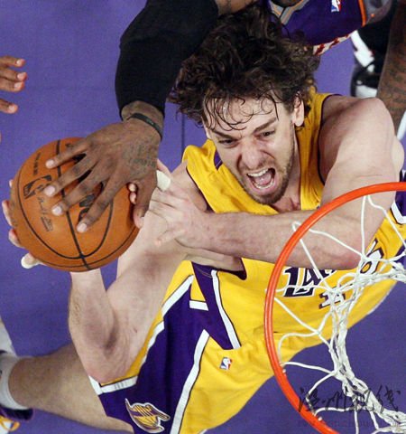 下半場上來,湖人內線再次發揮優勢。拜納姆大帽遮天蔽日,加索爾則是利用經驗造成洛佩茲走步。拜納姆連續2次犯規之后,湖人隊開始用奧多姆搭檔加索爾。加索爾先是籃下接到奧多姆傳球籃下爆扣,隨后又接到科比傳球中距離跳投得分。湖人隊借勢繼續擴大領先優勢,領先14分之后,太陽隊被迫叫了暫停。暫停后太陽連得5分,而加索爾馬上助攻費舍爾跳投命中,下回合他又接到奧多姆妙傳拋投得分。悄然間,加索爾的得分已經增加到15分。