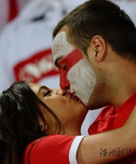 北京時間6月13日,世界杯小組賽C組將展開爭奪,英格蘭與美國隊在南非的皇家巴弗肯球場迎來對決,比賽開始前,英格蘭一對球迷在看臺上相擁激吻,他們表達愛意的方式也為南非賽場增添了一道靚麗的風景線。