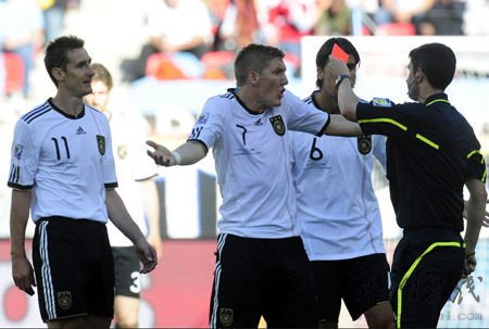 上場對澳大利亞的比賽,克洛澤打入一球,在3屆世界杯首戰中都有進球,而且共打入6球,是世界杯首戰之王。不過本場和塞爾維亞的比賽,克洛澤第37分鐘領到第2張黃牌被罰下場,德國隊也0-1輸掉比賽。在克洛澤領到紅牌后,德國隊球員顯然并不滿意,圍堵裁判以求改變判罰。施魏因斯泰格表情夸張向裁判申訴,但還是難以改變結果。