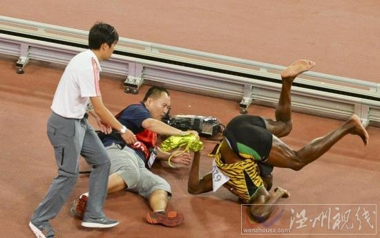 據(jù)悉,當(dāng)晚博爾特以19秒55再次拿下今年世錦賽的第10枚金牌。比賽結(jié)束后,他舉著國旗慶祝,突然遭到后方的攝像師撞倒。當(dāng)時這名攝影師是站在專用兩輪車上進(jìn)行近距離拍攝,但是由于小車車輪軋自動攝像機(jī)的軌道上,導(dǎo)致小車失控撞上博爾特。