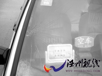 | 擋風玻璃被砸出裂痕。 林佩 攝 |