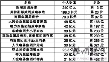 近日,中國財經雜志《新財富》發布2010年"新財富500富人榜",溫州富商13人上榜,個人總財富達856.6億元,占500富人財富總額的2.98%。其中新湖集團黃偉以個人財富240億元列第13位,成為浙江和溫州首富;美特斯邦威周成建家族和南都集團周慶治分別以個人財富198.3億元、78.8億元躋身百強榜,列榜單第23位、第92位。