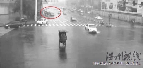 監(jiān)控錄像顯示:5月20日中午,天下著雨,溫州市區(qū)信河街上的車輛并不多。12點(diǎn)06分,一輛黑色的奔馳轎車突然轉(zhuǎn)向非機(jī)動(dòng)車道,撞到一名騎自行車的男子。該男子騰空約2米高,先落在了旁邊一輛三輪車的頂棚,繼而彈到地上,一動(dòng)不動(dòng)。此時(shí),黑色奔馳車非但沒有停車,反而加速逃逸。