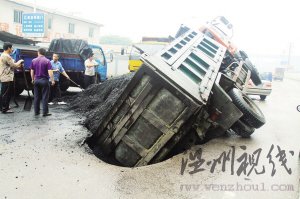 溫州網訊 昨天上午,一輛滿載煤炭的自卸貨車途經永嘉甌北五星大道時,路面突然發生塌陷,導致貨車左后輪掉進大坑,車身向左嚴重傾斜,煤炭灑落一地,所幸未造成人員傷亡。此前,該路段已發生過2次塌陷事故,有關人士解釋,路面塌陷主要與該路段的流沙地質有關。