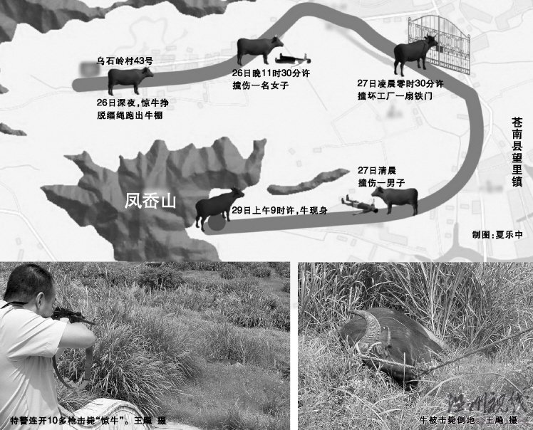蒼南縣公安局特巡警大隊的特警,聞訊后攜帶微型沖鋒槍趕來。據現場民警介紹,眾人先用石頭砸向牛,當"驚牛"迎面沖出來時,站在附近高處早已準備好的特警立即開槍,當場擊中牛的腦袋,看著還沒倒地的牛,特警又連開了10多槍。有經驗的村民說:"如果不能把牛徹底擊斃,一旦沖出來就非常危險了。"